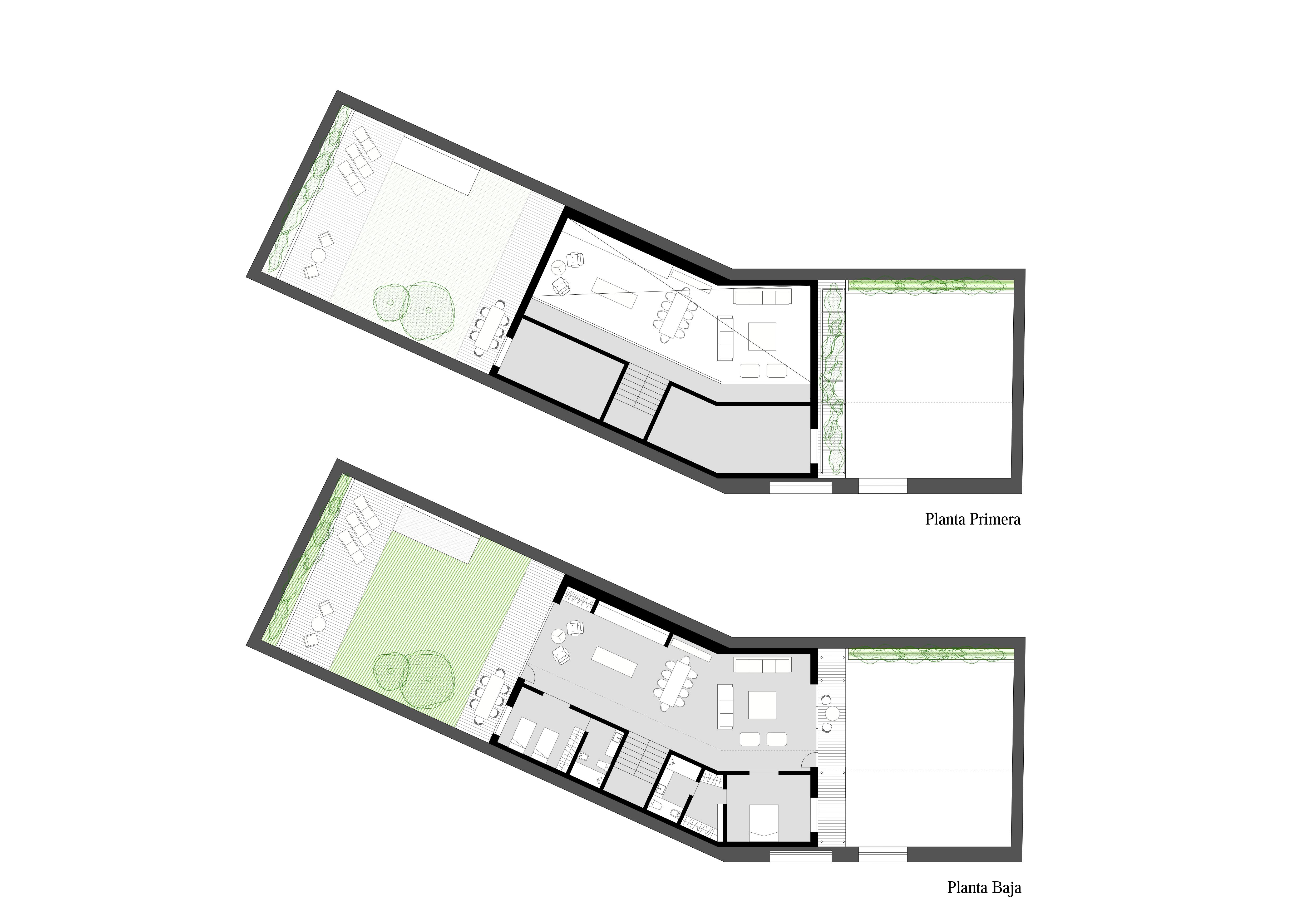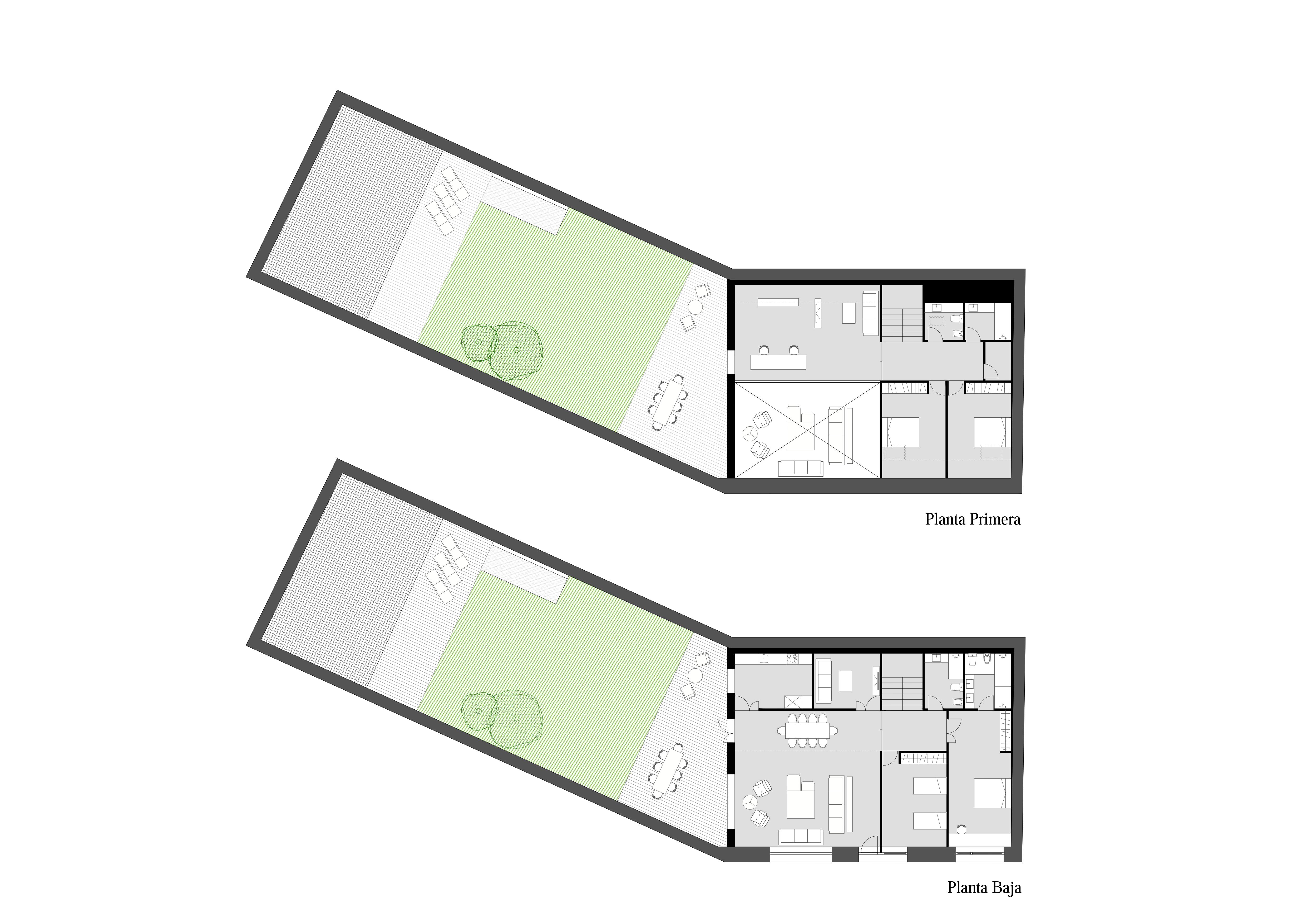 La primera es una vivienda pasante entre el patio delantero de entrada y el patio trasero, donde la segunda planta queda como posible crecimiento futuro de dos estancias conectadas por una pasarela volcada a la planta baja.