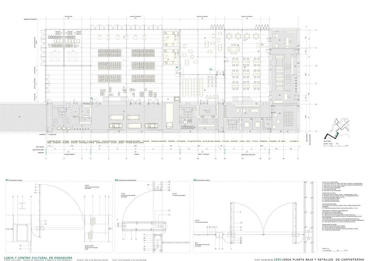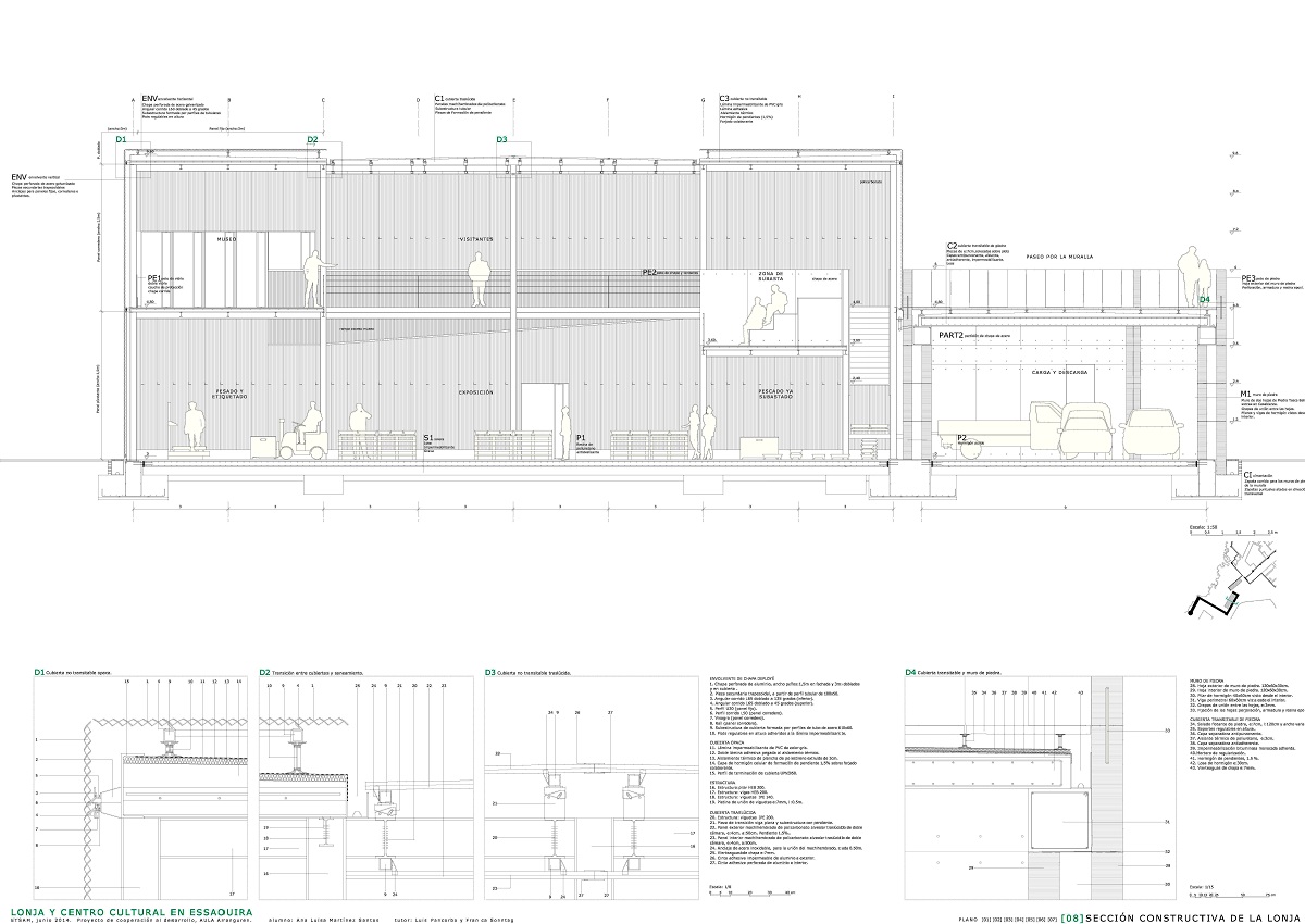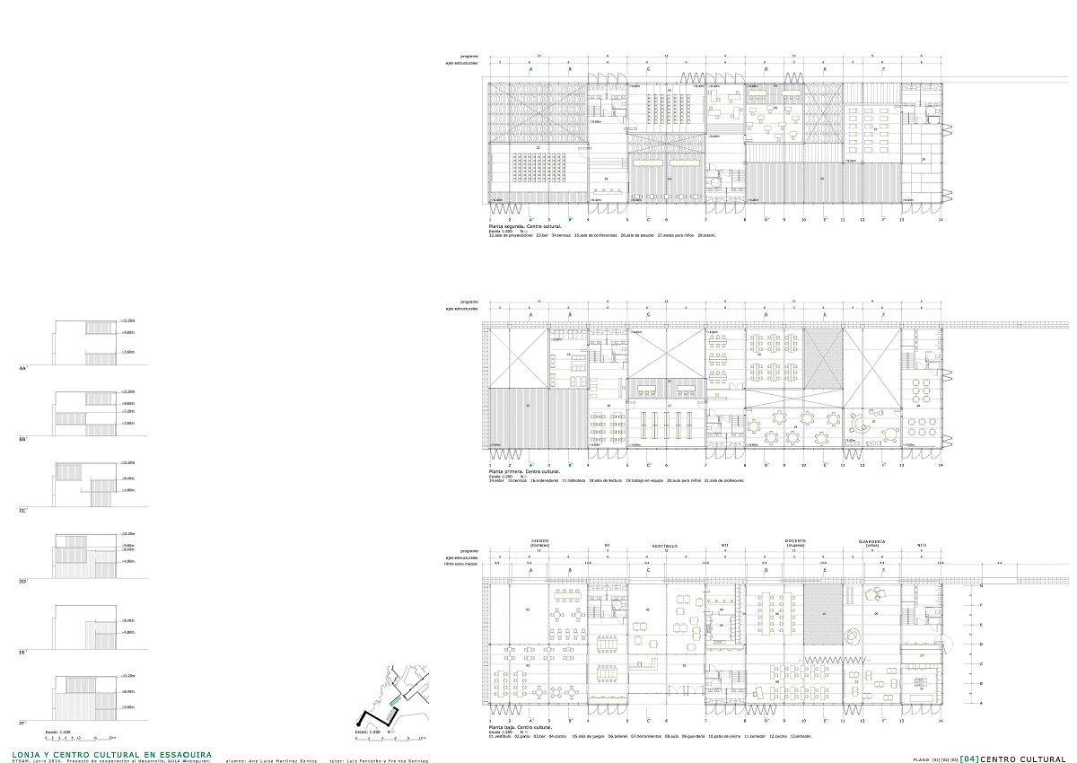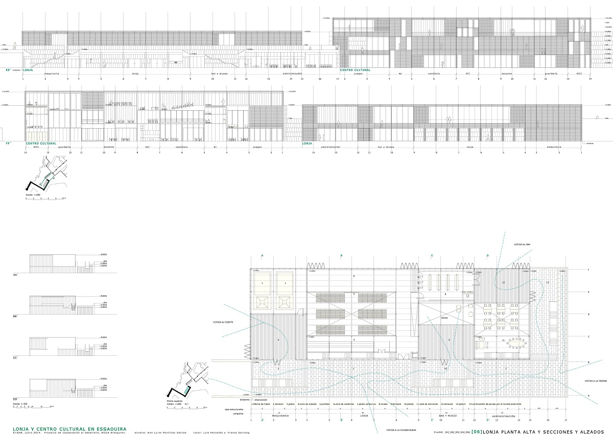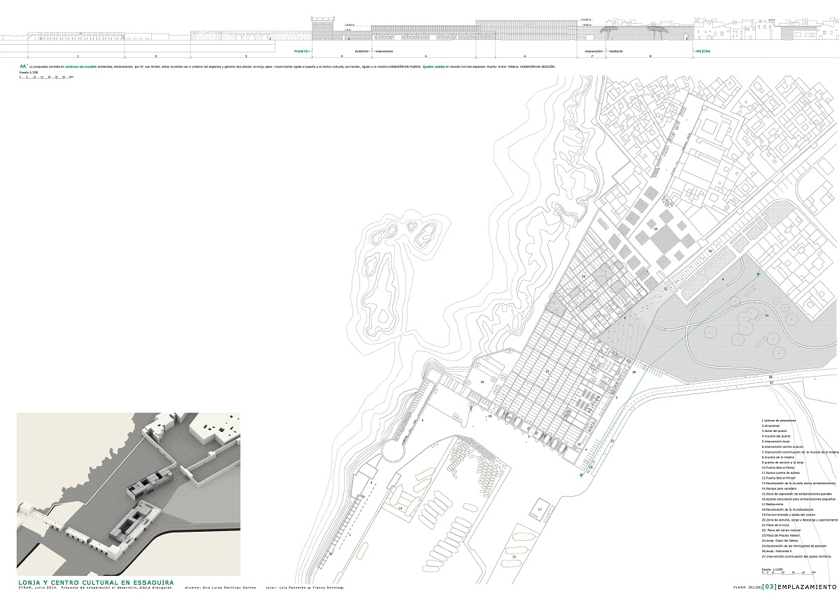 ETSAM 2013/2014. Tutor: Luis Pancorbo. El proyecto se ubica en Essaouira, Marruecos. Desarrolla desde una escala lejana un parque como espacio continuo entre la medina, la ciudad nueva y el puerto, que pretende esclarecer la estructura y la historia de esta ciudad en tres partes. En una escala más cercana desarrollo dos piezas: lonja y centro cultural, ligadas respectivamente al puerto y a la medina a través de la prolongación de sus correspondientes murallas formando una nueva puerta perteneciente al eje de puertas existente a lo largo de la medina, lo que engancha definitivamente el proyecto con la ciudad existente.
