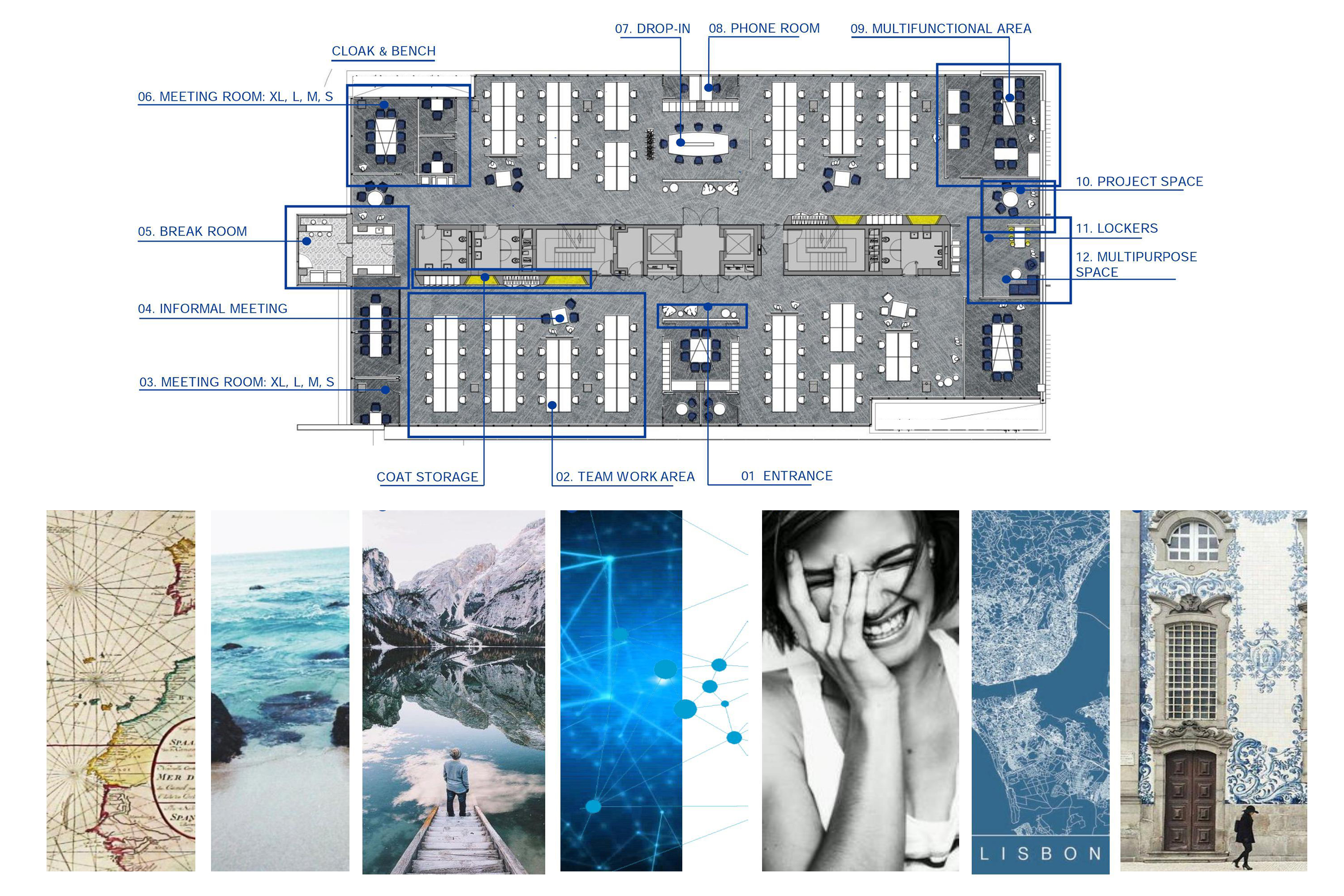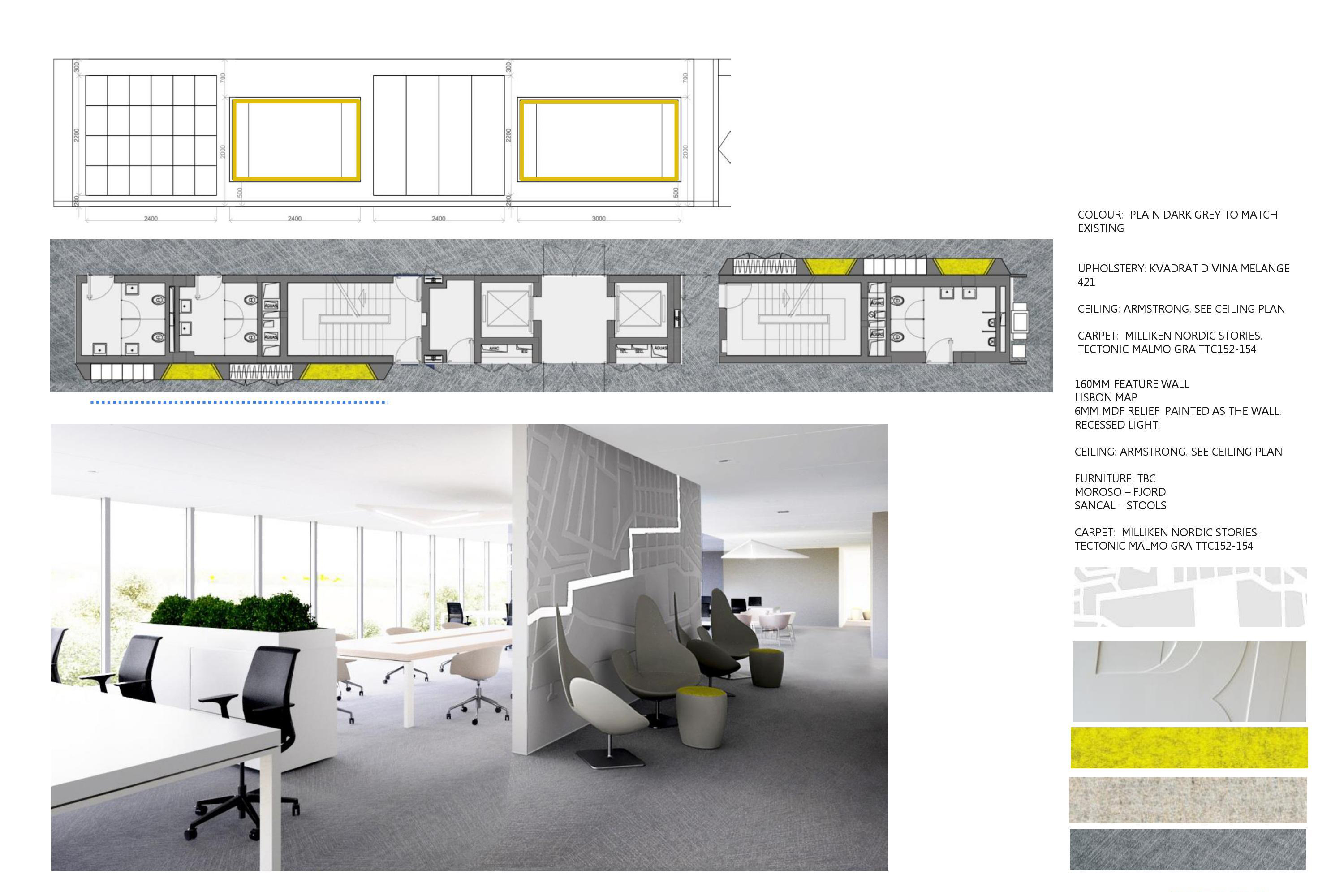 Diciembre 2016. Se trata de la implantación de las oficinas de una conocida marca de telefonía en un edificio de Lisboa. Es importante la disposición de los espacios según el concepto actual de oficinas. El look and feel satisface el carácter innovador del sector de la tecnología y la tradición de una ciudad con la potencia de Lisboa.