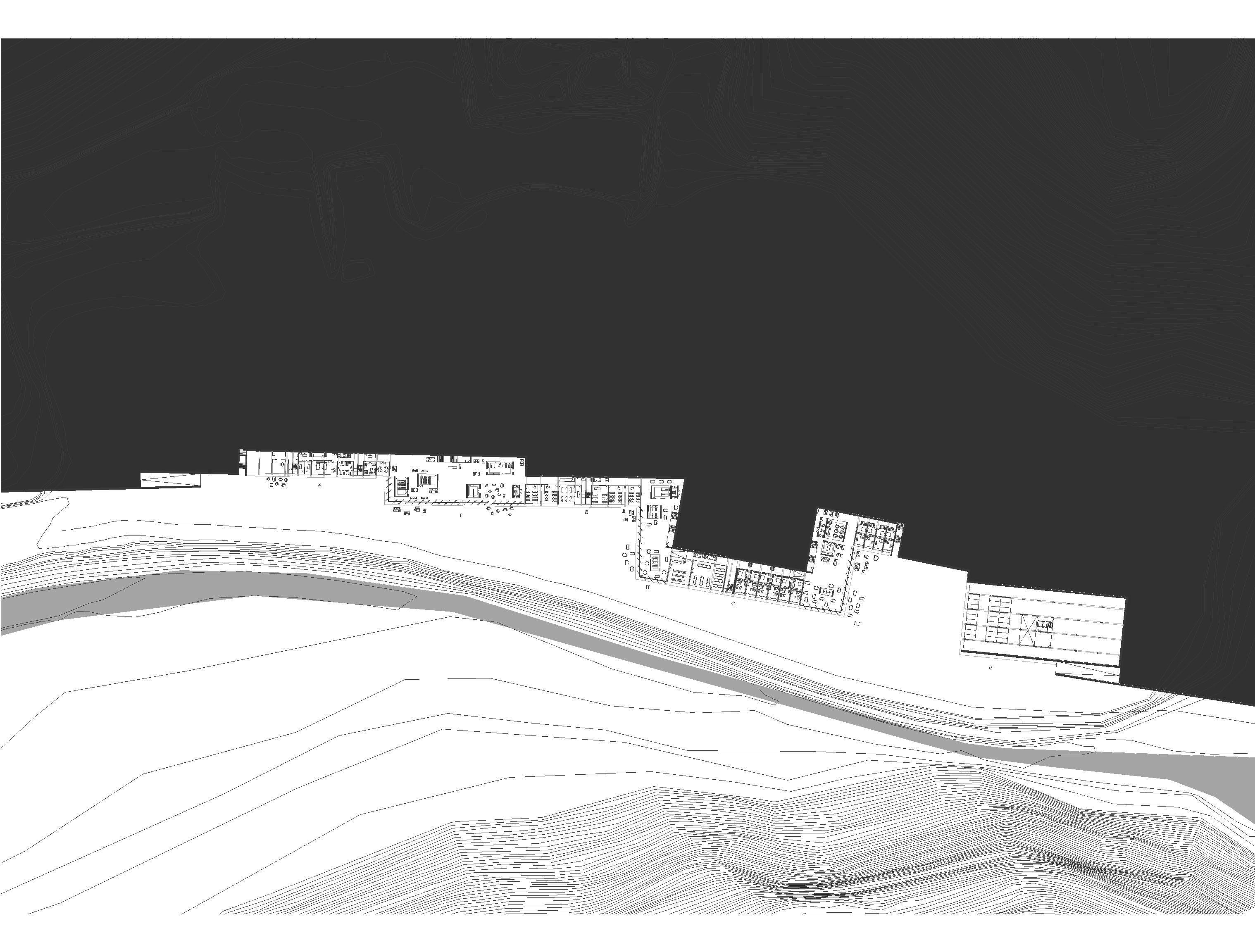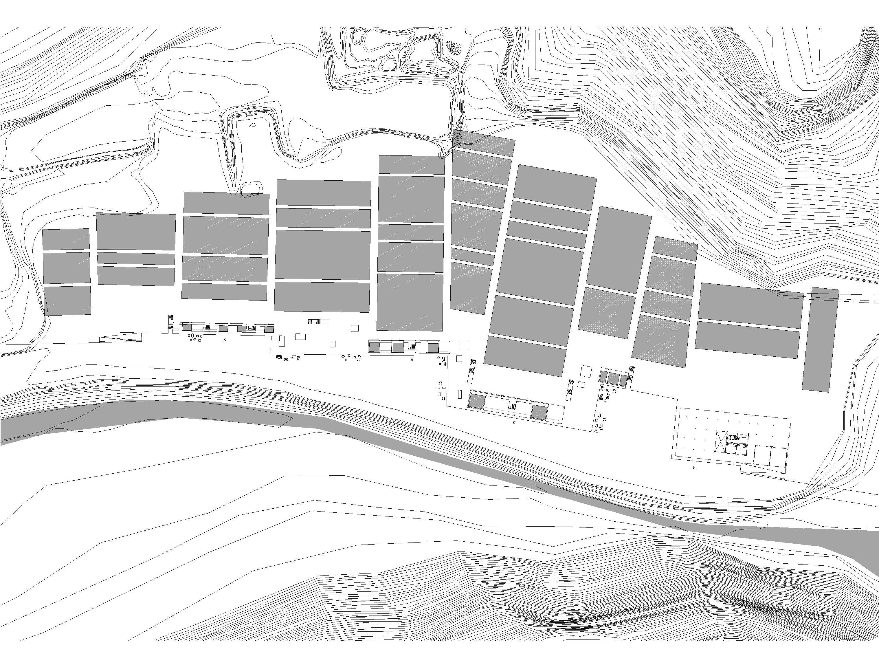 Otoño 2012 Profesor: Pepe Gallegos. El ejercicio consiste en reconvertir las instalaciones de una explotación minera en un centro de recuperación del paisaje. Se propone establecer un corte vertical en el terreno dejando dos niveles: en el nivel superior, en continuidad con la ladera que viene desde el pueblo están los cultivos y los invernaderos – se mantiene la estructura de las naves existentes y se envuelve con una piel de policarbonato: tectónico – en el nivel inferior, un paseo orientado al sur da acceso a las aulas, residencia y zonas de estudio, semienterrados: estereotómico.